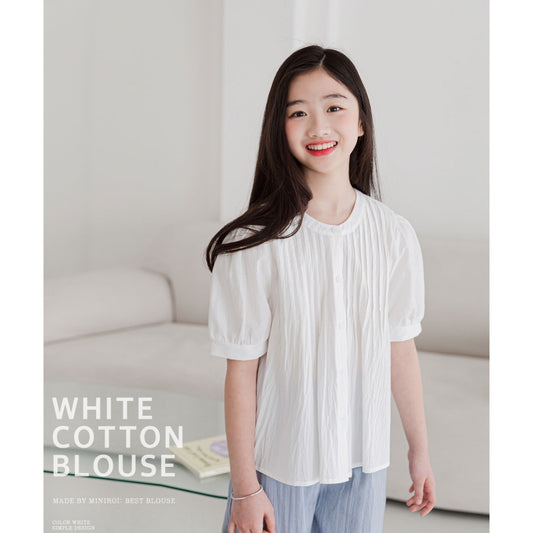 MINIROI ガールズブラウス 白 ナチュラル 半袖 ふんわり袖 パフ袖 涼しい 春夏 お出かけ着 かわいい コットン 韓国子供服 110cm 120cm 130cm 140cm 150cm