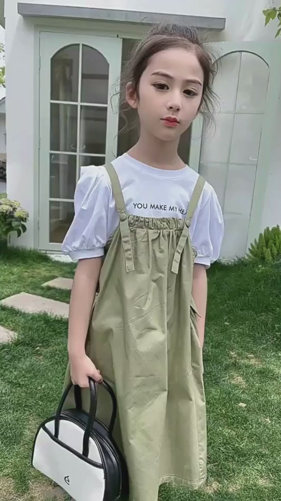 バルーン袖のシャツとジャンパースカートの上下セットアップ